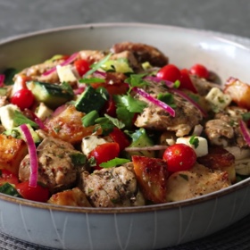 To make bowls, toss together cucumbers, tomatoes, red onions, feta cheese, chicken, potatoes, and dressing until evenly combined. Serve on top of a bowl of greens.